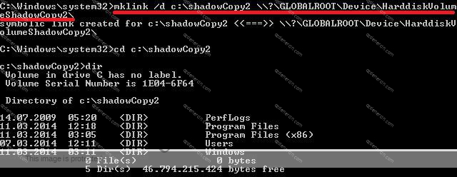 Bu dosyalardan uygun görülenlerden bir tanesi seçilerek “mklink /d c:\shadowCopy \\?\GLOBALROOT\Device\HarddiskVolumeShadowCopyX\” komutu (en sondaki ‘X’ karakterini değiştirme ve ‘\’ karakterini koyma unutulmamalı) ile sembolik bir oluşturulabilmektedir.