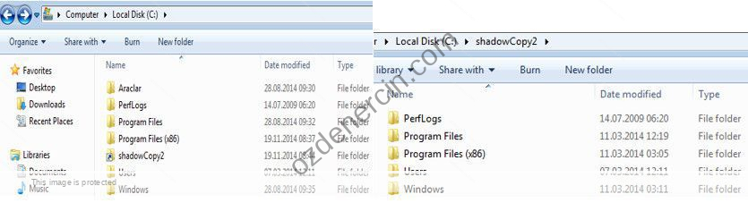 Cryptolocker zararlı yazılımı dosyaların yedeklenmesi amacıyla kullanılan bu shadow dosyalarını silmeye çalışmaktadır. Bu işlem Şekil 1’de gösterilmektedir. Fakat özellikle yeterli haklarla çalıştırılamadığı takdirde silme işleminde her zaman başarılı olamamaktadır. Bu sebeple şifrelenmiş dosyaların yedeklerini shadow dosyalardan bulmak mümkün olabilmektedir. Bu özellik Vista ve üzeri sistemlerde shadow kopyalama varsayılan ayar olarak aktif iken, XP’de bu özelliğin elle(manuel) aktif hale getirilmesi gerekmektedir.