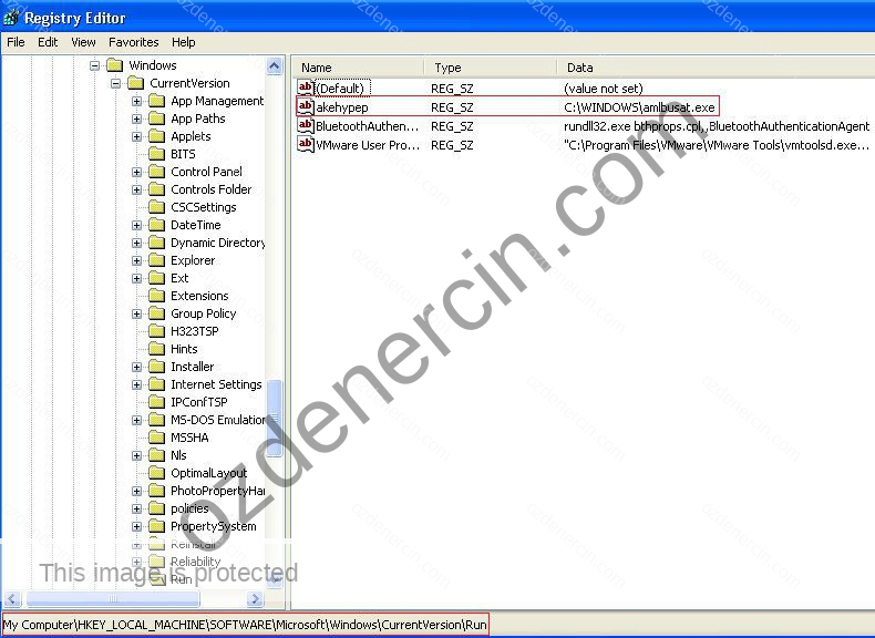 Zararlı yazılımın tekrardan çalışmasını engellemek için bu dosyayı bulup kaldırmak gerekmektedir. Bunun için “regedit -> HKLM\SOFTWARE\Microsoft\Windows\CurrentVersion\Run” ‘a girilmelidir.