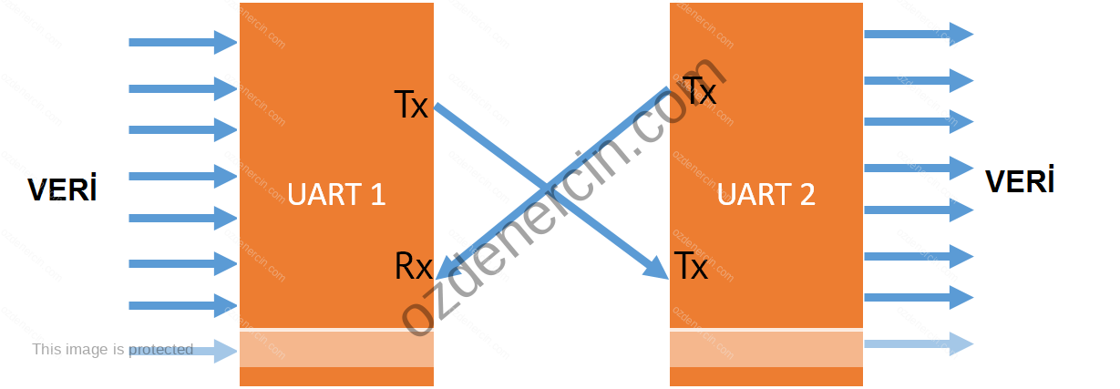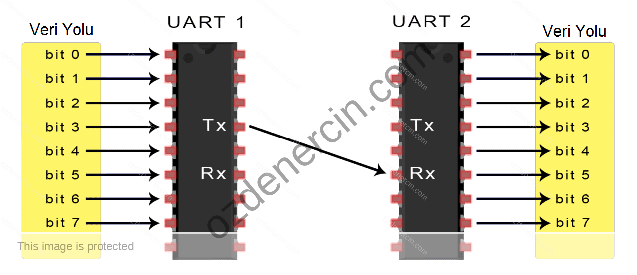UART verileri veri yolundan alır ve bu veriler CPU, bellek veya mikrodenetleyici tarafından gönderilir. Veri yolundan UART’a veri iletimi paralel moddadır. UART, bir veri paketi oluşturan veri yolundan alınan verilere başlangıç biti, eşlik biti ve bir durdurma biti ekler. Bu veri paketi verici tarafından alıcı UART’a seri olarak iletilir. Alıcı UART’ın alıcı pimi, veri bitini okur. Bu veriler tekrar alıcı UART’da paralel forma dönüştürülür ve alıcı UART, başlangıç biti, eşlik biti ve durdurma bitlerini kaldırdıktan sonra alıcı ucunda veri yoluna gönderilir.