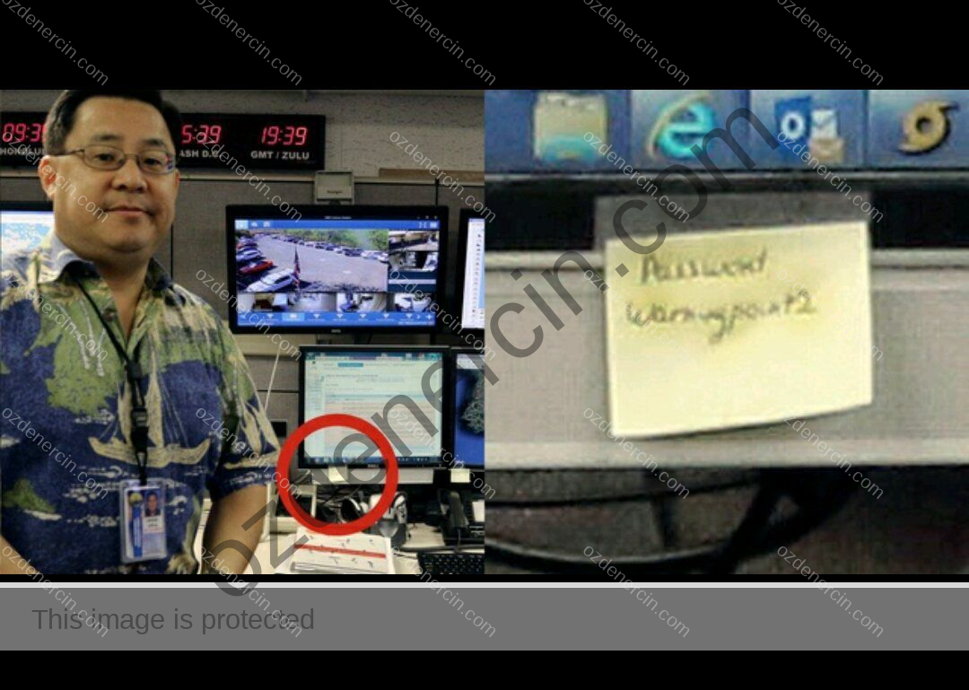 Şimdi biraz daha yakından bakalım ve resimdeki detaylara hakim olalım. Aşağıdaki resimde ne görüyoruz ? (Kullanıcı adı ve bir şifre) BINGO !!! Tam’da bir saldırganın aradığı şey, tadından yenmez 🙂 İşte bu örnekte olduğu gibi saldırganlar sadece bakmayıp, detayları görüyor ve sonrasında; Havaii’ye bir füzenin yaklaştığı uyarısı, panik, kaos ve prestij kaybı… Merak edenler bu paylaştığım linkten ilgili haberi okuyabilir.