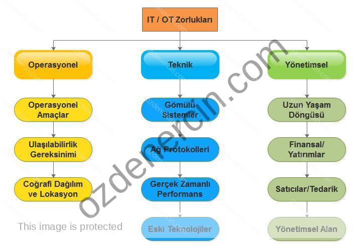 OT, genellikle daha zorlu bir güvenlik ortamı sağlayan ek yönetimsel, operasyonel ve teknolojik kısıtlamalara sahiptir. OT güvenliği, neredeyse sadece kullanılabilirlik ve güvenlik konusuna odaklandığından, OT ve IT için güvenlik fikri aynı değildir. IT ve OT arasındaki tarihsel farkların köklü olmasına rağmen, yeni teknolojiler IT ve OT alanlarının bir araya gelmesine neden olmaktadır. Bu sebeple, bu yazımda bu IT ve OT’deki farklılıklara değineceğiz ve daha sonra bu farklılıkların siber güvenlik ile ilgili etkilerini tanımlamaya çalışacağız.
