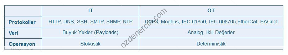Endüstriyel Kontrol Sistemi, özellikle IT gereksinimlerini desteklemek için özel olarak tasarlanmış, geleneksel IT’de yaygın olarak kullanılanlar da dahil olmak üzere çok geniş bir ağ protokolü setine sahiptir. Aşağıdaki tablo ile OT ve IT’ye özgü bazı protokolleri ve iki alan arasındaki bazı farkları özetleyebiliriz.