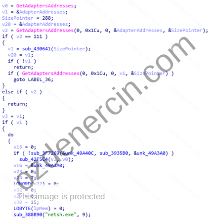 İlk analizlerimde, LockerGoga’nın tek başına WannaCry veya Petya/NotPetya gibi yayılma yeteneğine sahip olmadığını gördüm. Statik analiz sonucunda LockerGoga’nın virüslü sistemin Wi-Fi ve/veya Ethernet ağ adaptörlerini sıraladığını görüyoruz. Daha sonra, sistemi herhangi bir dış bağlantıdan kesmek için komut satırı (netsh.exe arayüz setini DISABLE ediyor) üzerinden CreateProcessW fonksiyonu ile devre dışı bırakmaya çalışıyor. LockerGoga, bu rutin şifreleme işleminden sonra ancak mevcut hesaptan çıkmadan önce çalıştırır. Bu dikkate değer bir özelliktir. Dosya şifreleme rutini, LockerGoga zaten hesapların şifrelerini değiştirerek kullanıcıyı sistemden uzak tuttuğu için daha az sonuç verici olarak kabul edilebilir.