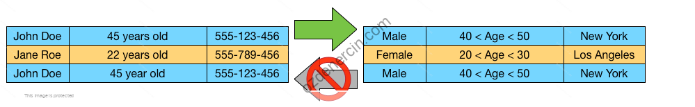 Bu yöntemde, alanların bireysel değerleri daha geniş bir kategoriyle değiştirilir. Örneğin, Yaş alanının 19 değeri ‘≤ 20′, ’23’ değeri ’20 <Yaş ≤ 30 ‘ şeklinde değiştirilebilir. Bu, hassas verilerin yapamayacağı şekilde kalıcı olarak değiştirilmesidir. Aynı zamanda geri dönüşü olmayan bir işlemdir, yani verilerin orijinal tanımlanabilir biçimine geri döndürülemez. Genelleştirilmiş veriler GDPR kısıtlamalarına tabi değildir.5